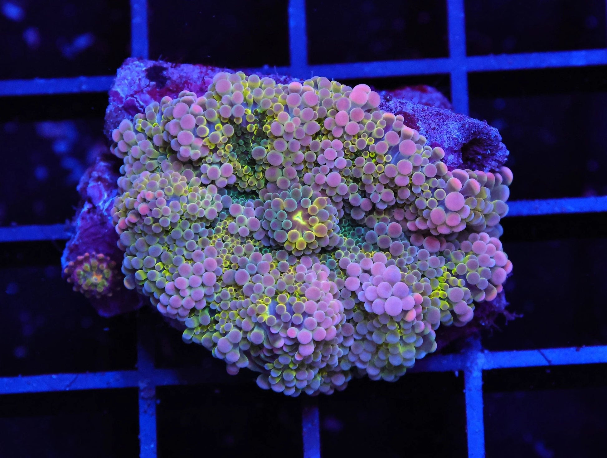 Each polyp features a mesmerizing pattern of deep pink to lavender-purple polyps offset by brilliant, electric yellow and lime-green oral discs and tentacles. When fully inflated under actinic lighting, the entire colony glows with an intensity unmatched by common Ricordea. This is a cluster of pure saturation and movement that is perfect for the avid collector.